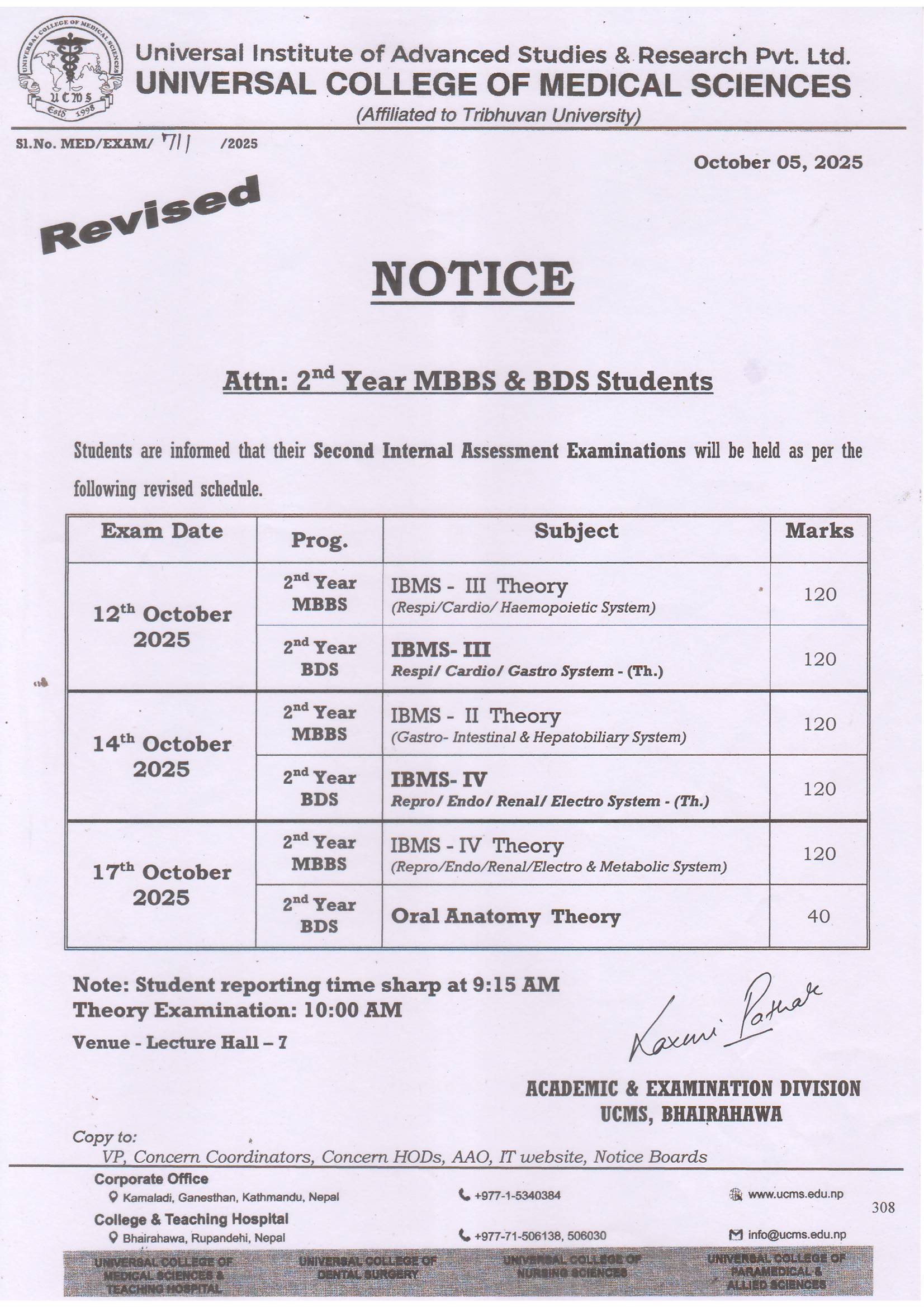 - Revised IA Exam Notice of 2nd Year MBBS & BDS